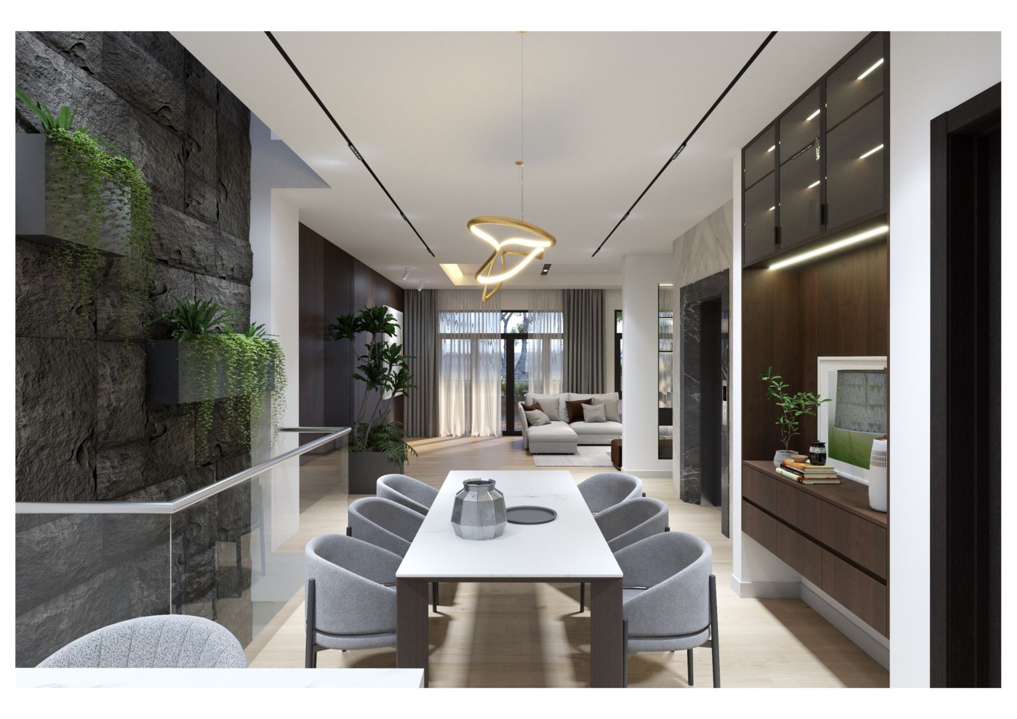 Khu vực này đóng vai trò là trung tâm kết nối các thành viên trong gia đình, đồng thời tạo nền tảng cho tổng thể không gian sống hiện đại và tiện nghi.