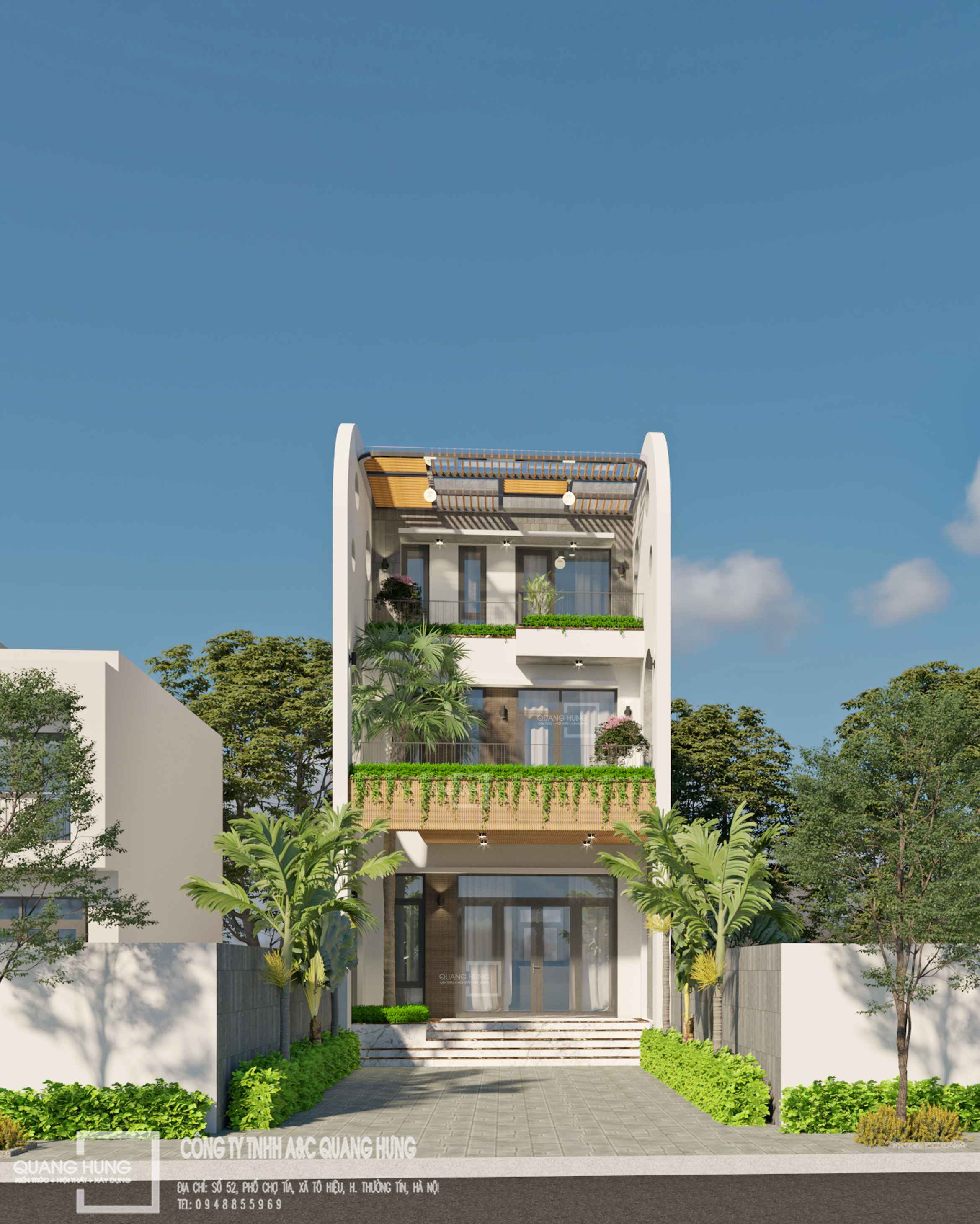 Điểm chạm đầu tiên khiến người xem “dừng lại” chính là hệ ban công phủ xanh nhiều tầng: